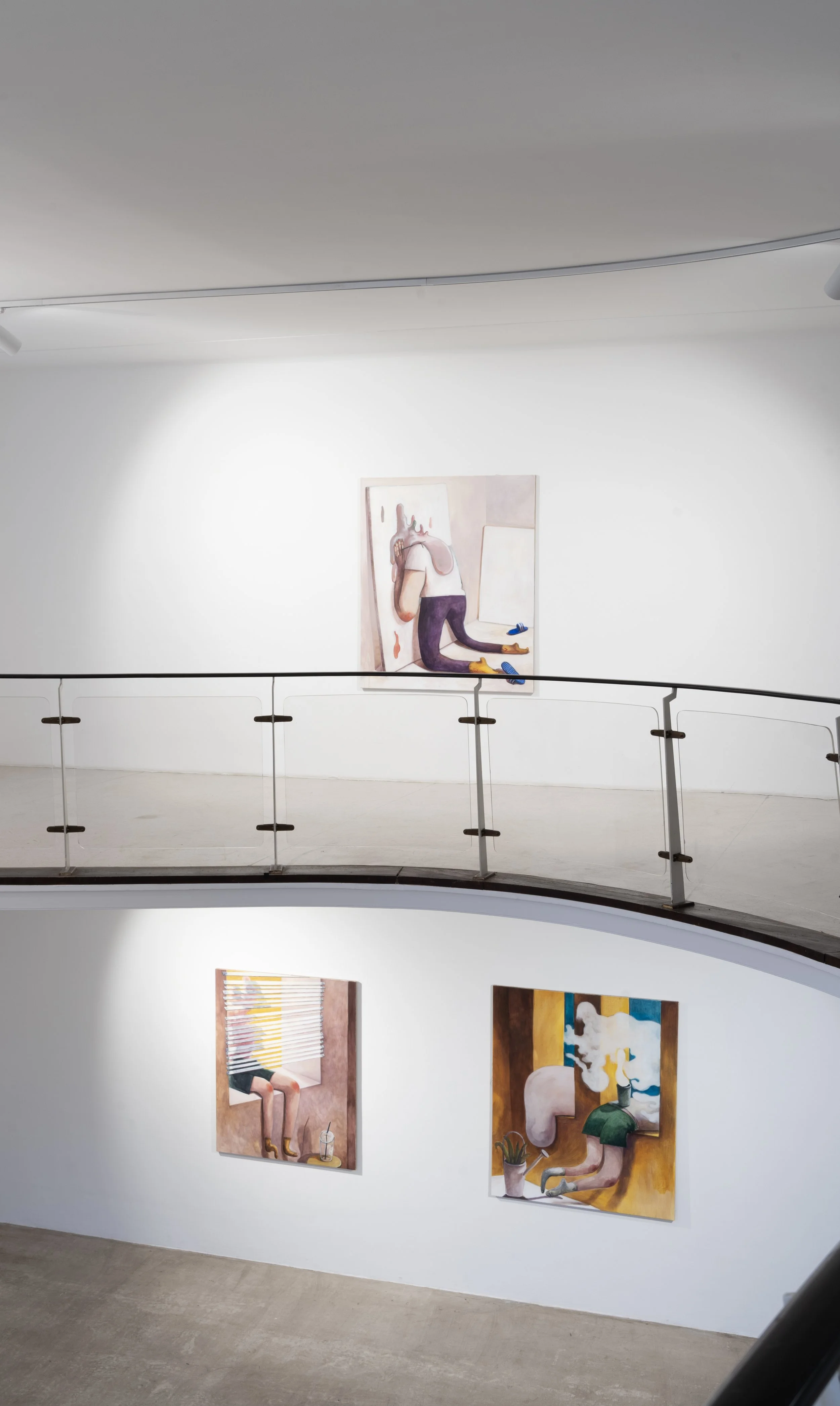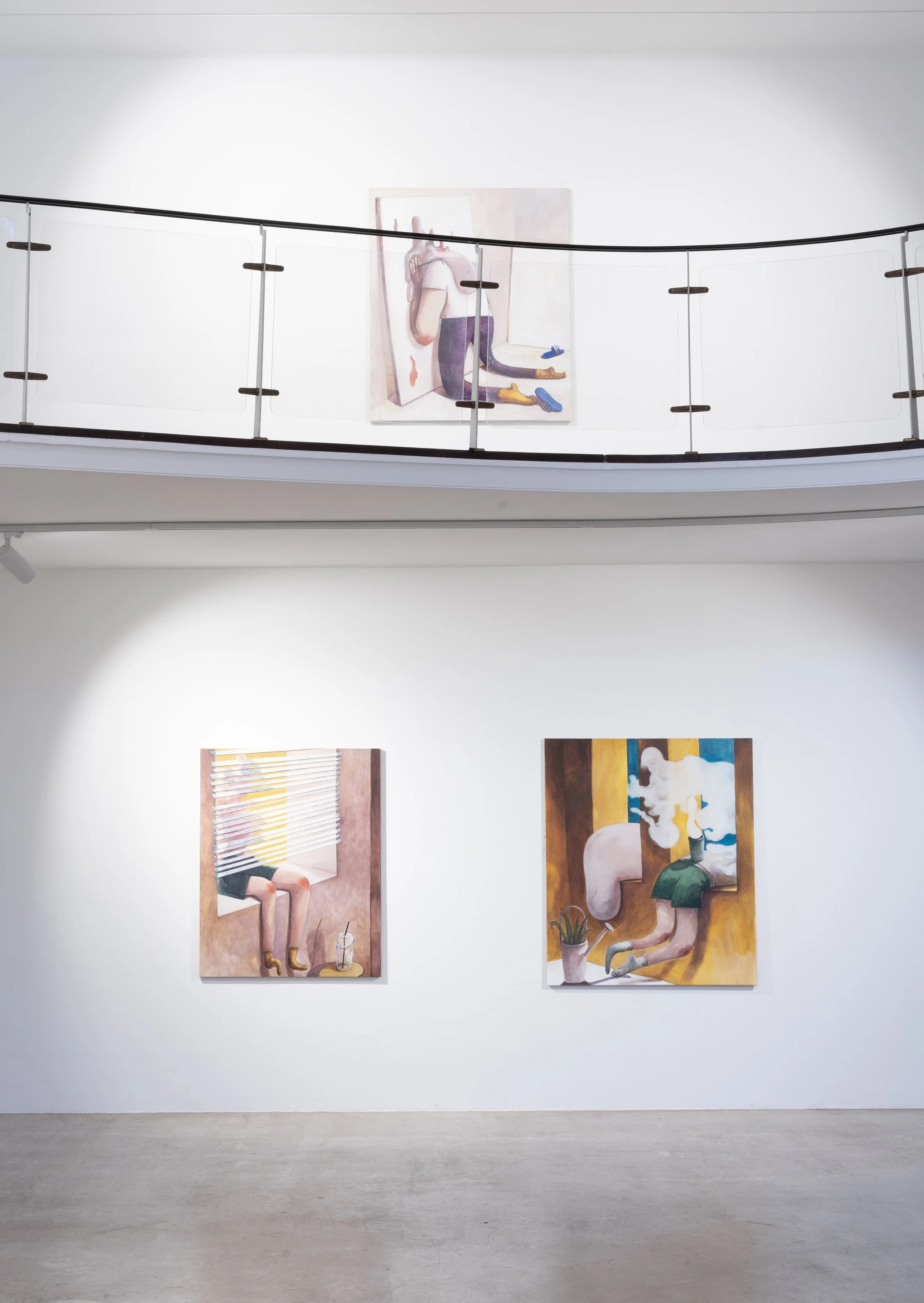 Jeehye Songs Gemälde scheinen uns mit offenen Armen zu empfangen. Einzelne Figuren sind in begrenzten, irgendwie privat wirkenden Räumen zu sehen, Accessoires des täglichen Lebens liegen herum. Trotz kräftiger Farben ist die Stimmung aber eher verhalten, gedrückt. Es entsteht aus der Isolation der Figuren im begrenzten Bildraum ein gemeinsamer Wunsch nach Ausbruch, eine Sehnsucht nach dem Draußen. Die Wege dorthin sind vielfältig – durch’s Fenster, durch die Leinwand oder durch das Maul einer Zimmerpflanzenkolonie.