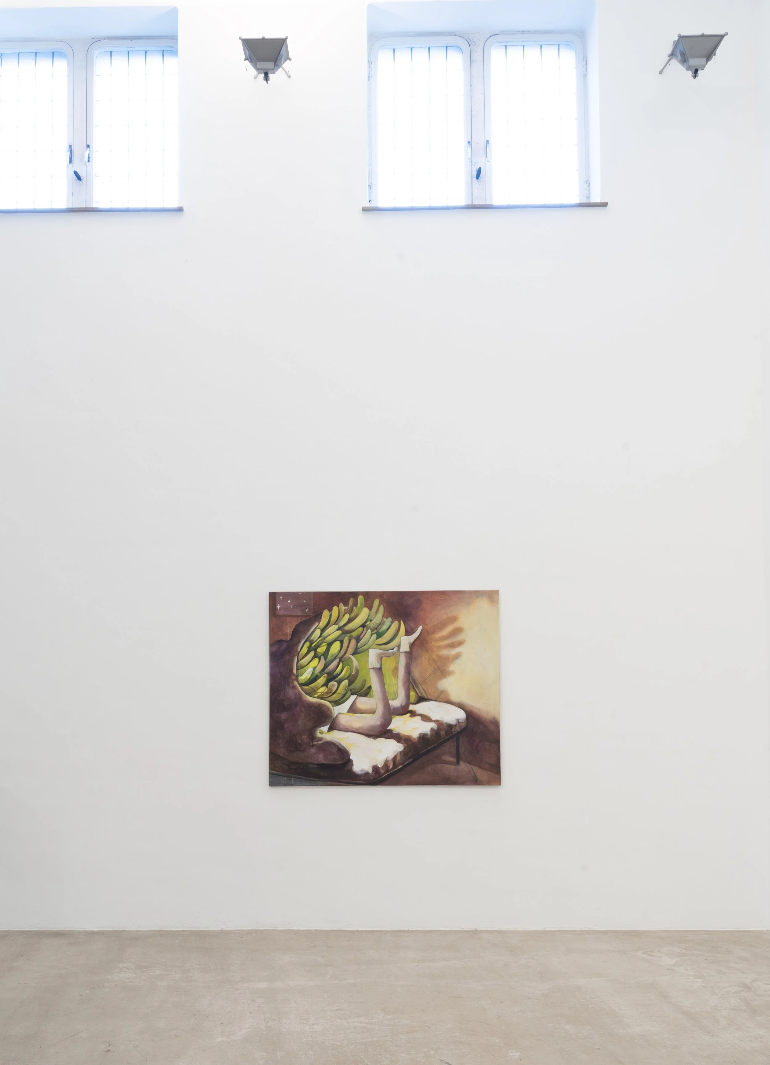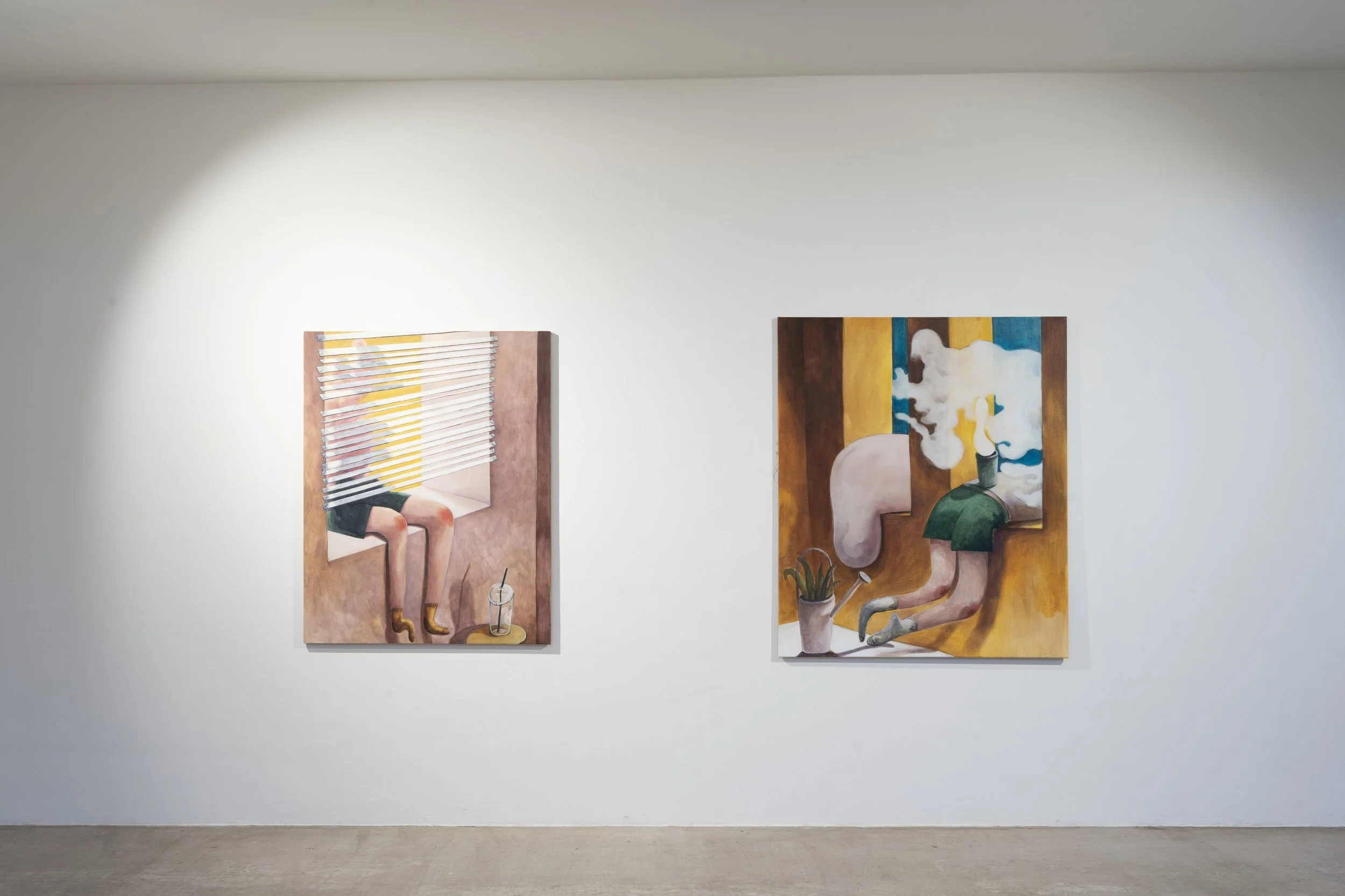 Jeehye Song’s paintings seem to welcome us with open arms. Individual figures appear in confined, somewhat private-looking spaces, with everyday objects scattered around. Despite the bold colors, the atmosphere remains subdued, almost heavy. From the isolation of these figures within the limited pictorial space emerges a shared desire for escape, a longing for the outside. The paths leading there are varied — through a window, through the canvas, or through the mouth of a colony of houseplants.