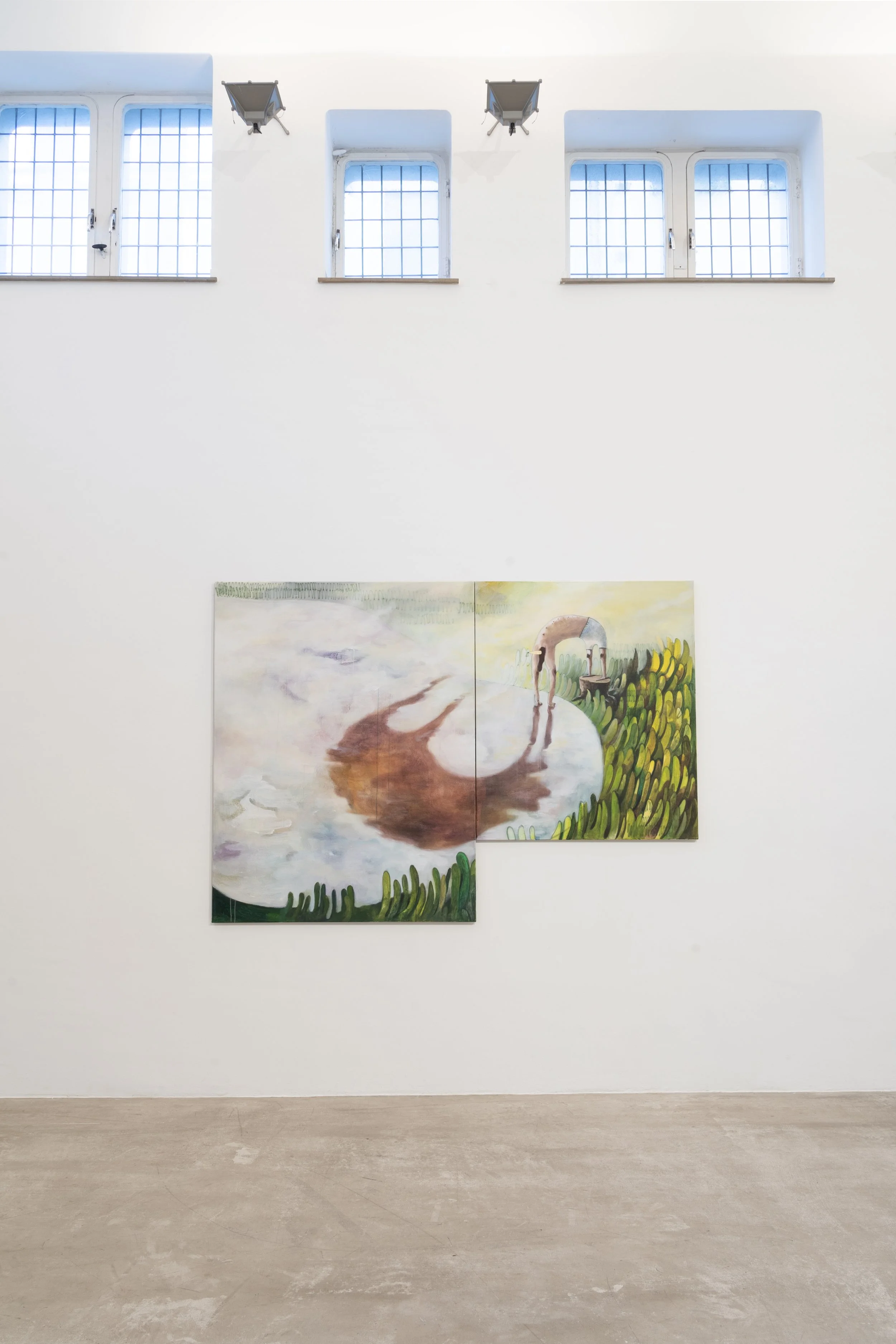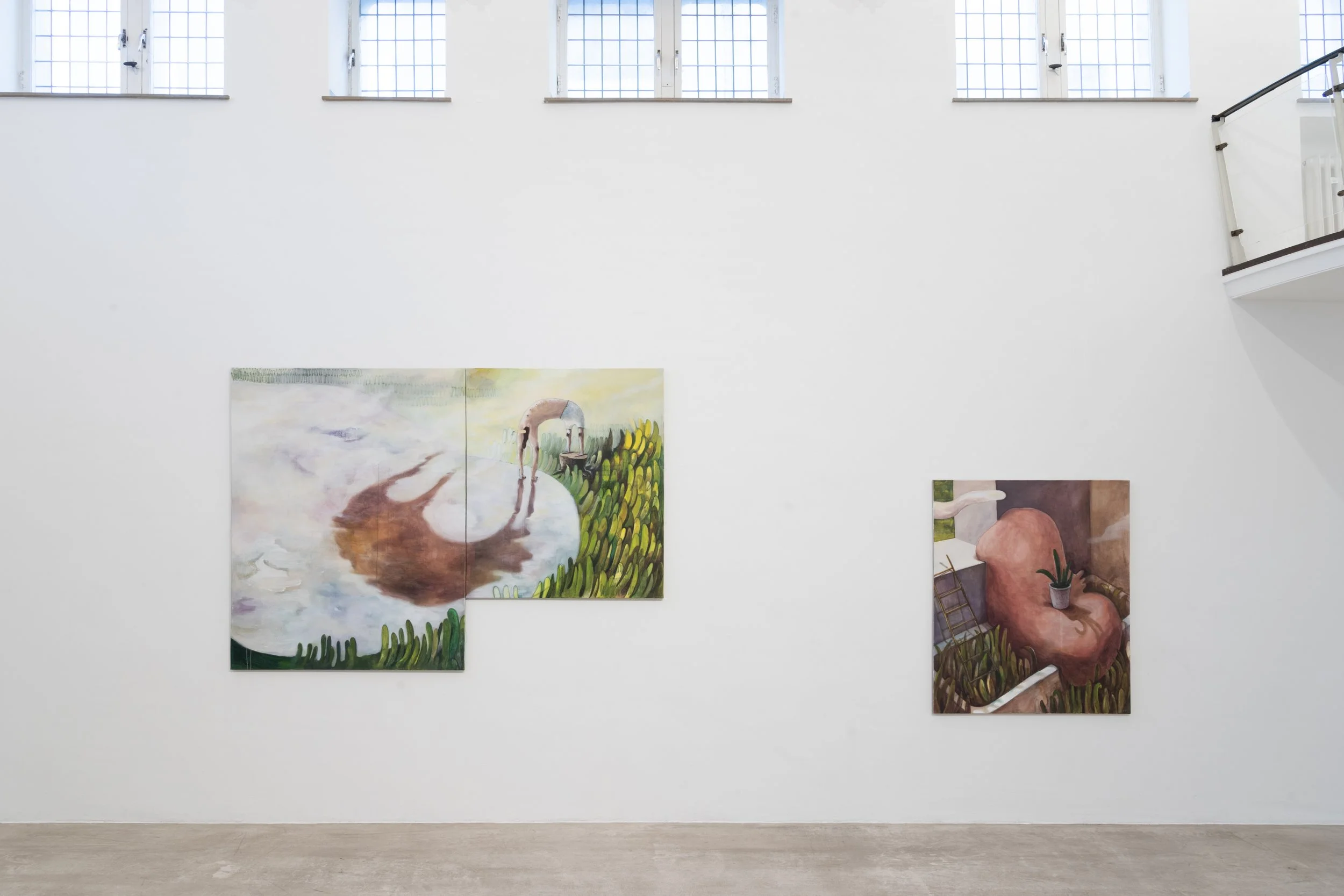 Waren die Werke von Jeehye Song zum Zeitpunkt der Juryentscheidung noch von den Beschränkungen der Corona-Pandemie geprägt, in denen ihre Figuren völlig erschlafft die verordnete Isolation und Langeweile irgendwie zu bewältigen suchten, so findet in der jetzigen Ausstellung ein echter Aufbruch statt. Die Personen werden aktiv – auch wenn das Körpergefühl immer noch ganz weich ist – sie haben ihre Schlaffheit überwunden und suchen nach neuen Erfahrungen.